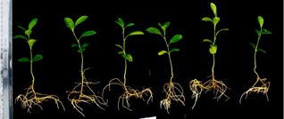 चित्र 1. सूखे के कारण उत्पन्न रूपात्मक लक्षण, जैसे कि पत्तियों का मुरझाना, पत्तियों का गिरना, पीला पड़ना और सूखना, जो विभिन्न नींबूवर्गीय मूलवृंत संकर पौधों में देखे गए